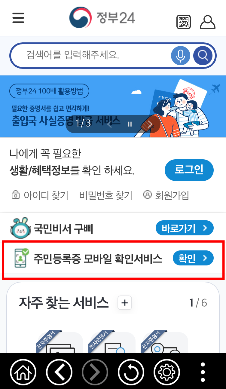 메인화면에 주민등록증 모바일 확인서비스가 바로 보입니다.