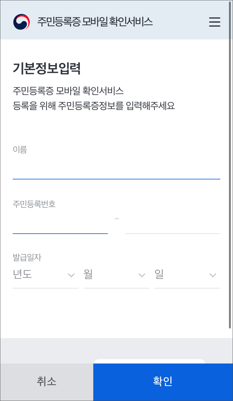 이름과 주민등록번호, 그리고 실물 주민등록증에 기재된 발급일자를 입력해주세요.