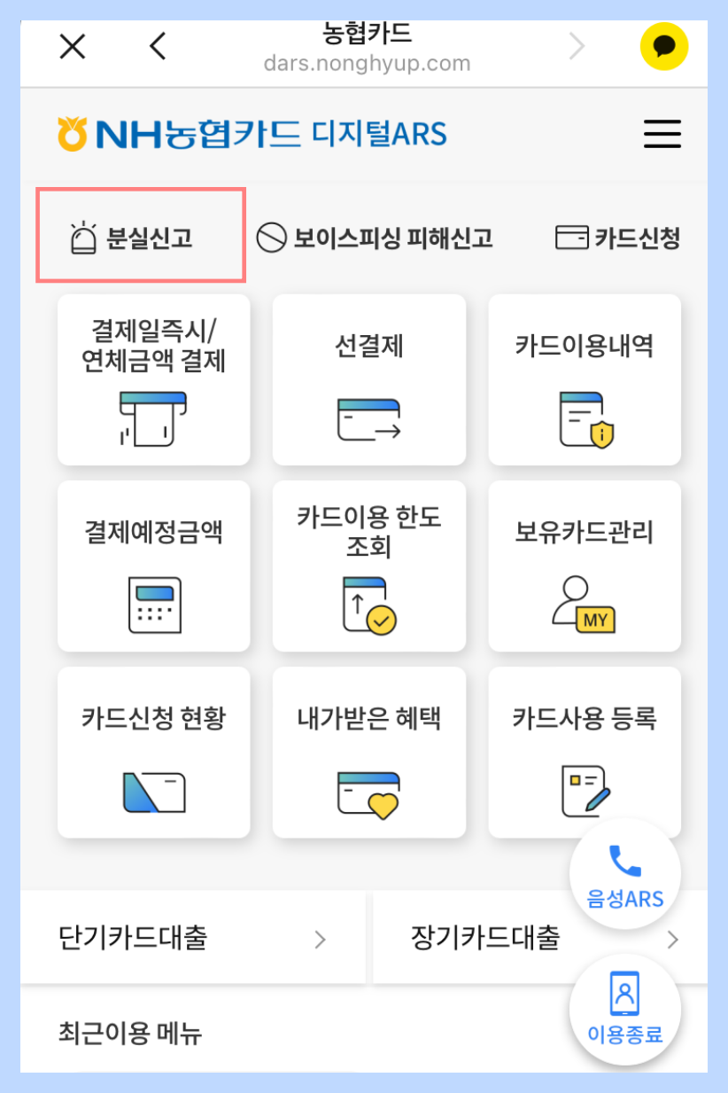 농협카드 디지털 ARS 화면으로 이동합니다.