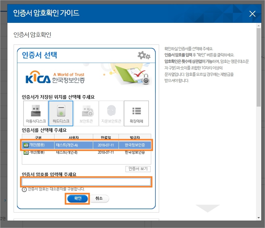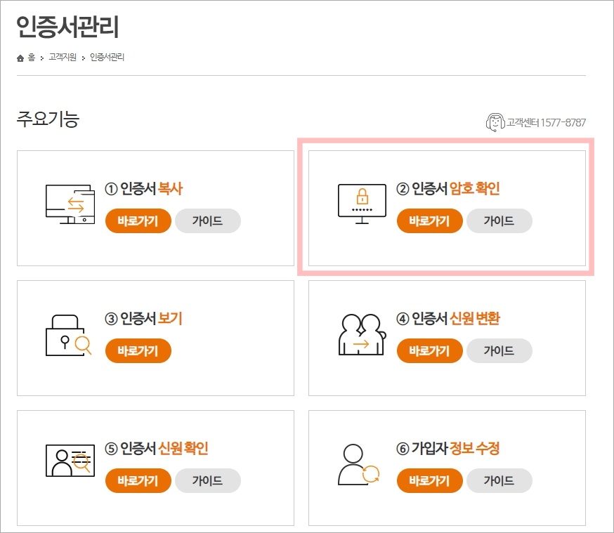 인증서 관리 페이지의 메뉴들 중 ② 인증서 암호확인으로 들어갑니다.