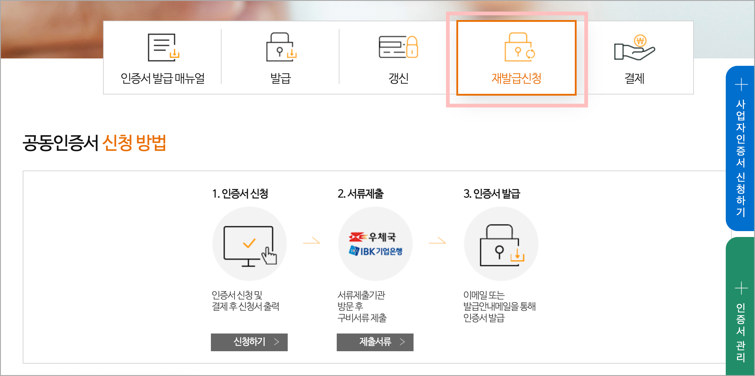 인증서 재발급은 해당 사이트(한국정보인증)에서도 가능하고, 인증서를 발급받은 은행의 인증센터에서도 가능합니다.