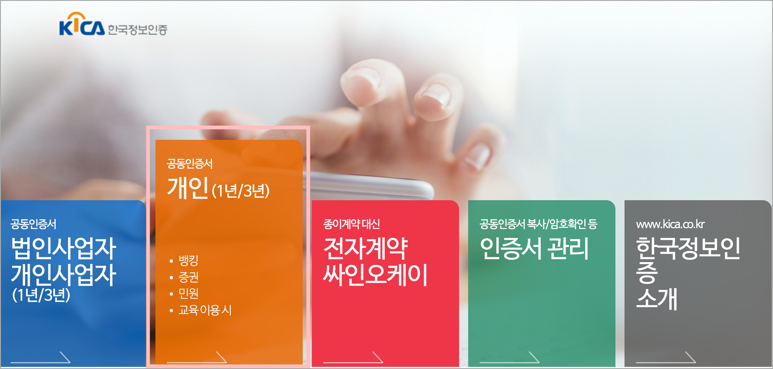해당사이트(한국정보인증) 메인페이지의 개인 메뉴를 선택합니다.