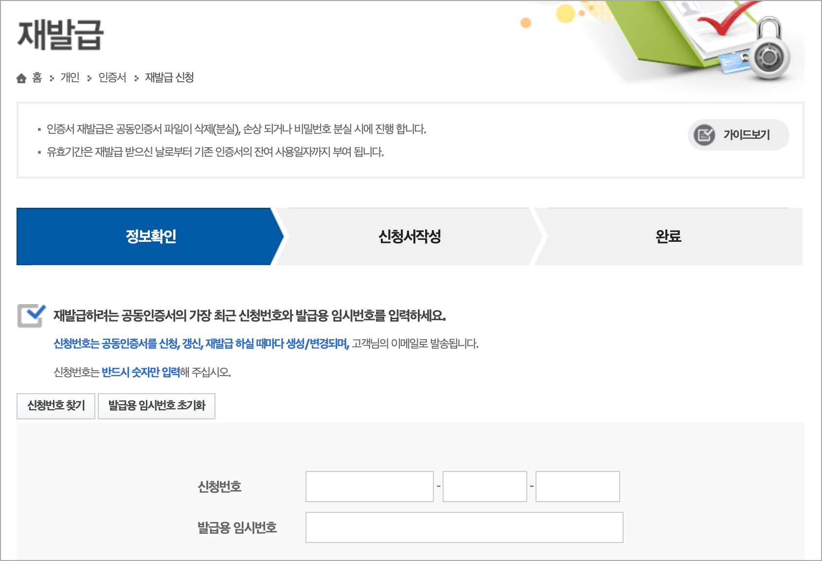 재발급시 신청번호와 발급용 임시 번호를 입력하라고 하네요.