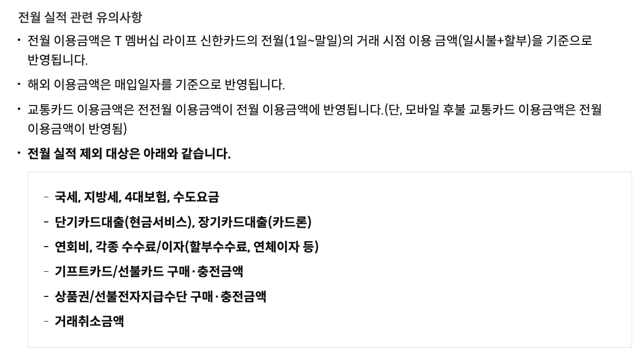 - 준월 이용금액 산정 기준은 '전월 실적 관련 유의사항'을 참고 바랍니다.