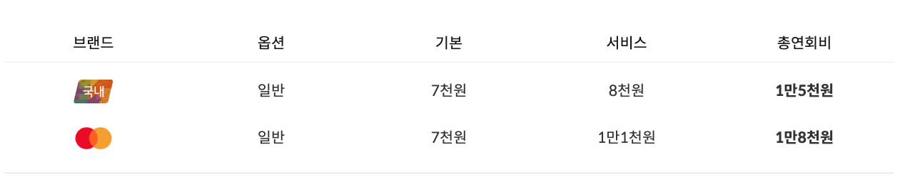 연회비는 국내전용 1만 5000원, 해외겸용(MASTER) 1만 8000원입니다.