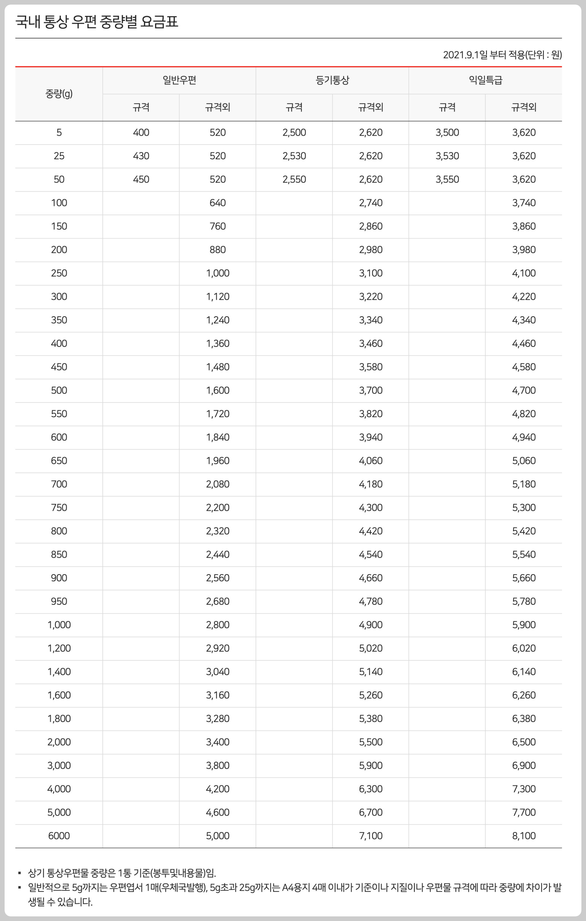 자세한 중량별 요금표(일반우편, 등기통상, 익일특급) 는 아래를 참고하세요~