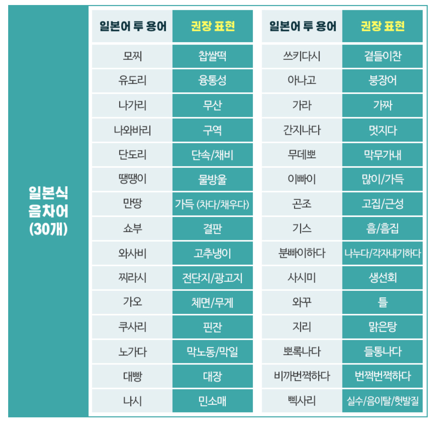 국립국어원이 선정한 일상생활에서 흔히 쓰이고 있는 <꼭 가려 써야 할 일본어 투 용어 50개>