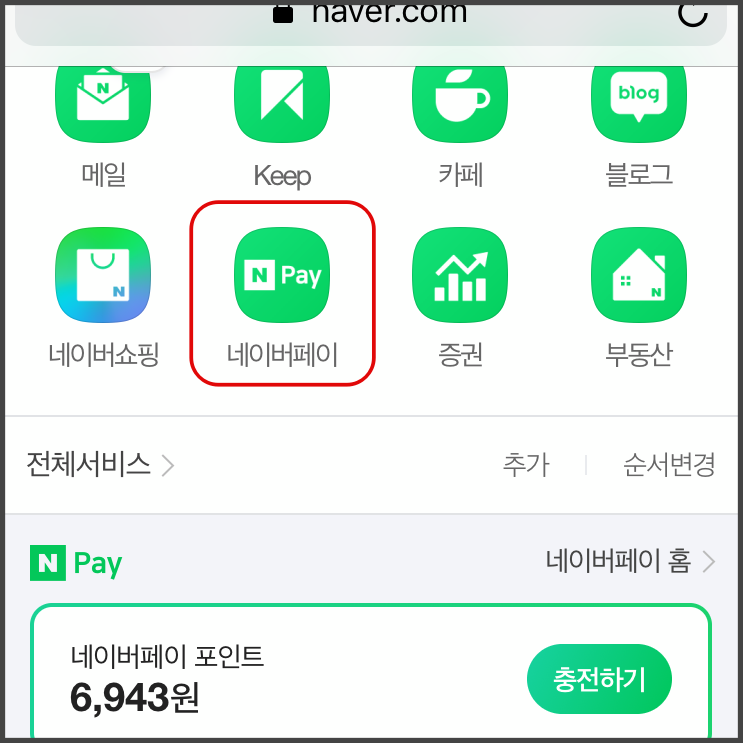 네이버페이로 들어간다. (모바일 웹 화면이다)