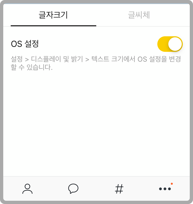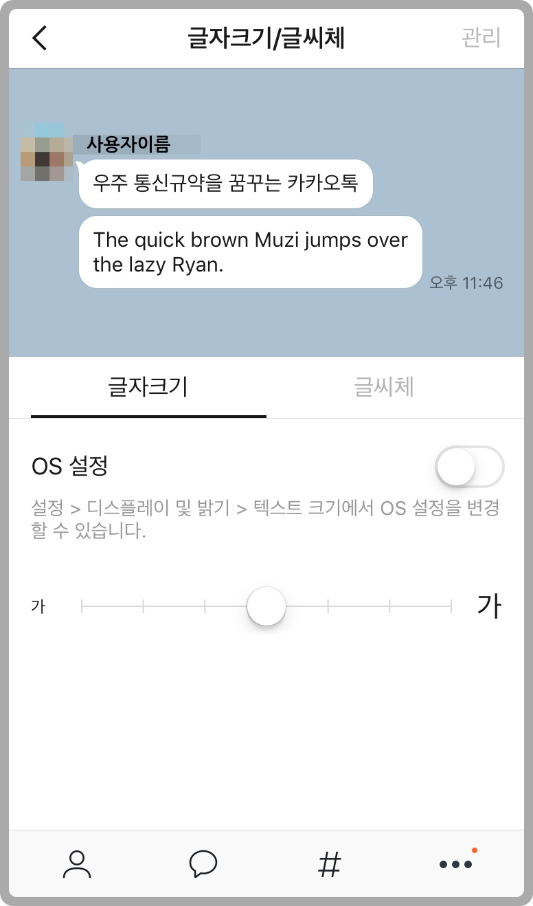 다만, 오늘 카톡 글자크기 조절을 해도, 카카오톡의 친구 목록이나 채팅목록의 글씨는 커지지 않더라구요~