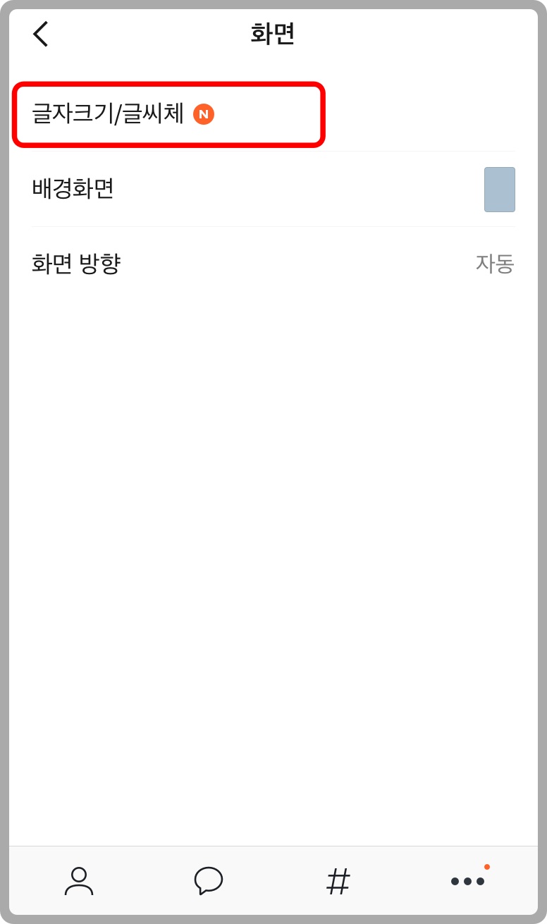 혹시 폰에 따라 되는 게 있을지 모르니, 친구 목록이나 대화목록의 글을 키우길 원하시면 폰 자체의 텍스트 크기를 조절해 보세요~~ 아직 카톡에서 목록의 글씨를 키우는 방법은 없는 것 같습니다