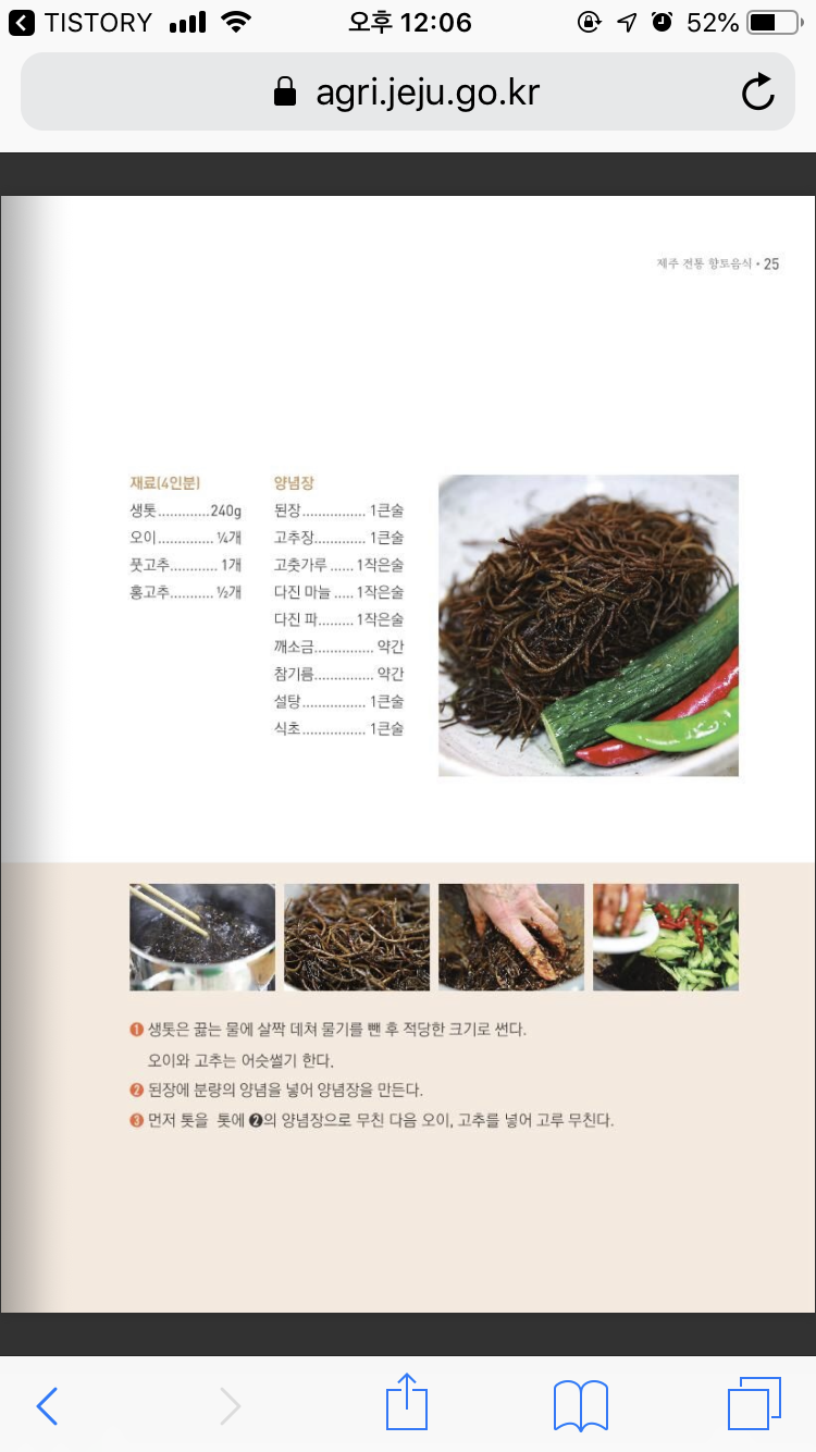 제가 참고한 레시피는 제주 특별자치도 농업기술원에서 만든 '제주의 농촌 밥상을 엿보다' e-book을 참고 하였습니다.