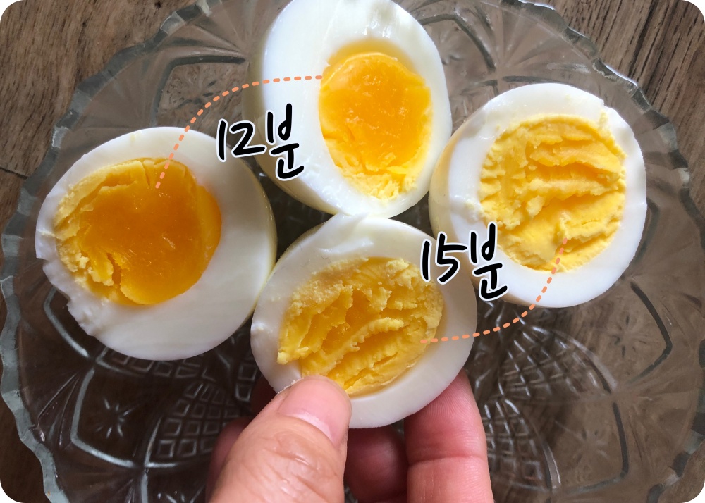 두 개 삶았는데 시간을 달리해 봤어요~ 12분 삶은 것이 거의 반숙에 가까운 완숙이라고 해야 할까요??? 오늘은 평소보다 조금 덜 익은 것 같아요~ 어쨌든 3분 차이의 익힘 정도는 위와 같아요.... 👍