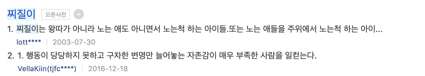 오픈사전에 다른 사람들이 써 놓은 글을 보면 누구나 찌질이일 수 있고, 누구나 찌질이였던 적이 있을 것 같은 느낌도 듭니다.