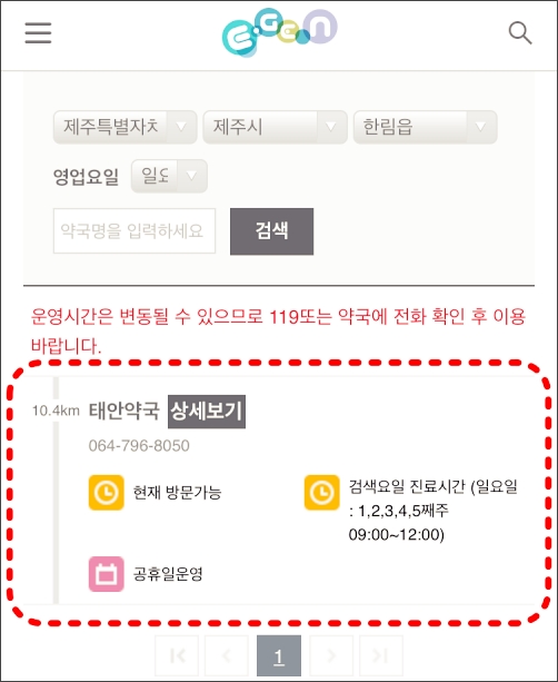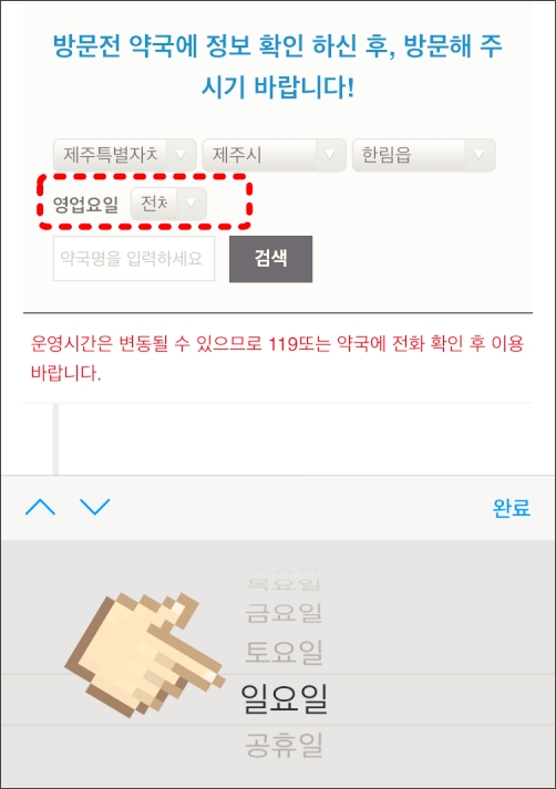 제가 일요일로 검색해 본 결과 선택한 지역에 하나의 약국이 나오네요.