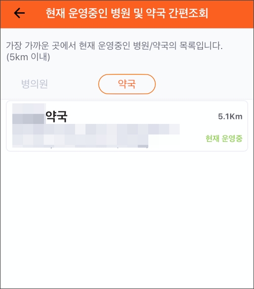 약 5KM이내에서 현재 운영중인 병의원과 약국의 목록을 볼 수 있습니다.