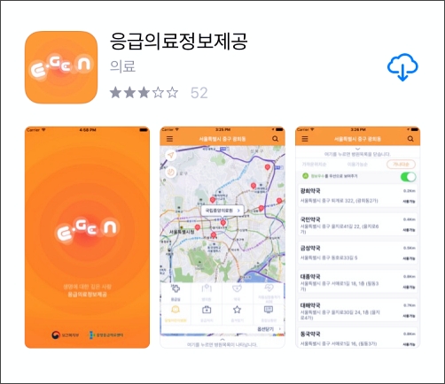 (어플이 없다면, 앱스토어나 구글플레이스토어에서 응급의료 정보 어플을 검색해서 깔아두시면 유용하게 사용할 수 있을 것 같습니다.)