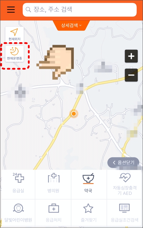 어플에서 현재 운영중을 클릭하면 빠르게 현재 운영중인 약국 검색이 가능합니다.