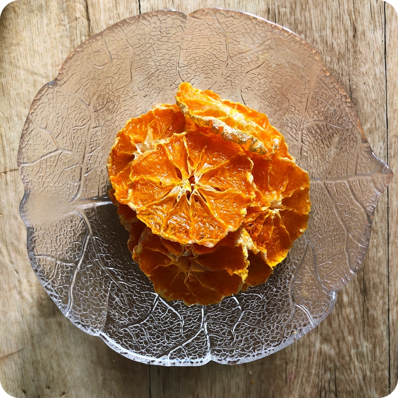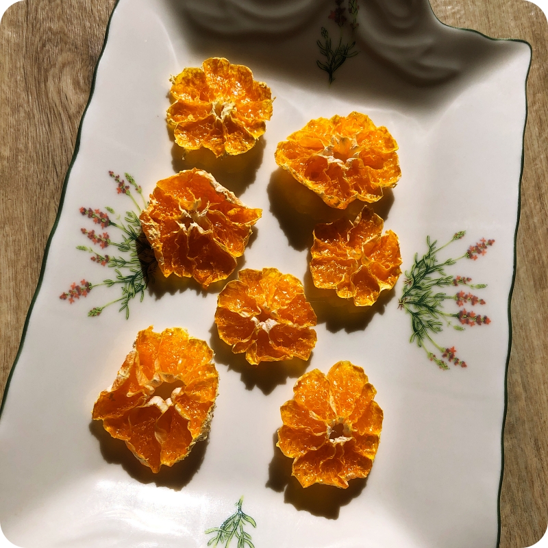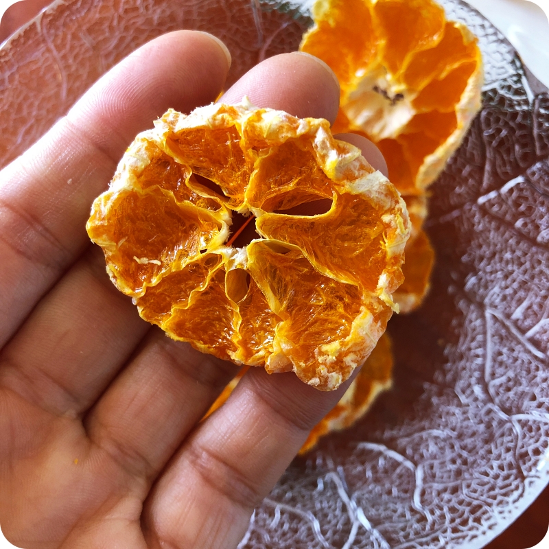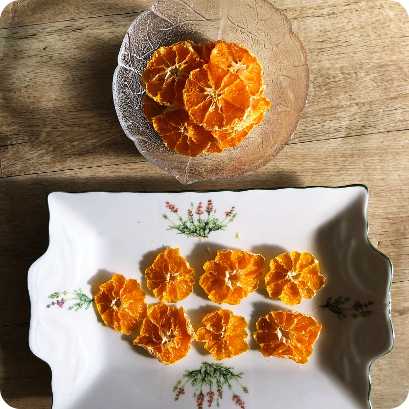 그릇에 담아보아요~ 어때요? 보기 좋은 감귤말랭이가 만들어진 것 같지 않나요? 잘 말려진, 잘 구워진 귤말랭이는 바삭한 식감과 함께 안쪽으로 쪽득한 느낌이 있어요. 만약 알갱이가 톡하고 씹히면 좀 더 말려야해요~ 물론 그런 식감이 좋다면 상관없지만, 바삭하고 쫀득한 느낌이 제일 좋은 것 같아요~ 더 말리면 바삭한 맛이 더 강하겠죠..