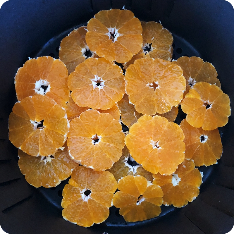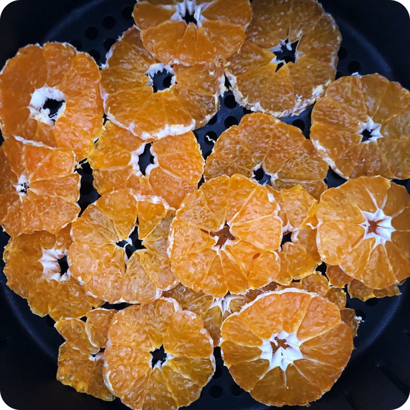 귤 4개를 썰어 넣었습니다. 에어프라이어가 한 칸이라 한번에 많은 양을 할 수 없어 아쉬워서~ 좀 겹치더라도 많이 해보면 어떨까 생각해서 해봤어요. 중간에 자리 바꿔주고 뒤집어주고 하려고합니다. 아, 그리고 귤도 너무 얇게 썰려고 노력하진 않았어요.. 껍질 벗긴 귤 하나당 4-5개로 슬라이스 했습니다. 그리고 100도로 맞춘 에어프라이어에 구워줍니다.