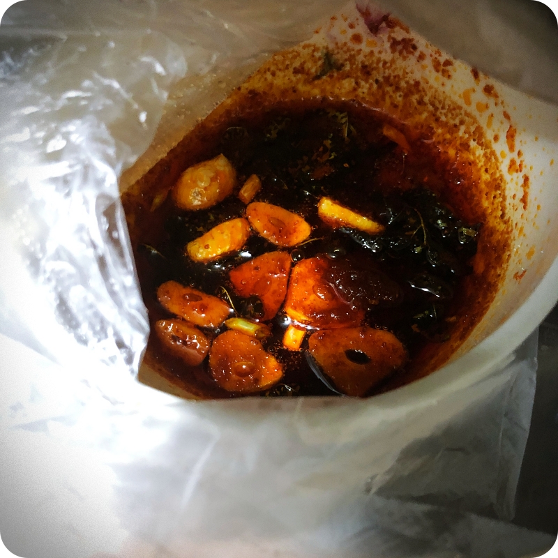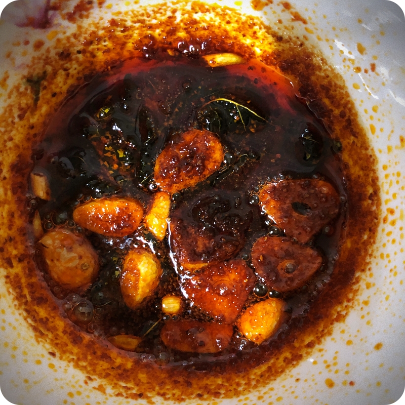 👉재료 : 편썬 마늘(2-3쪽), 다진생강 조금, 고춧가루(2T), 깻잎, 식물성 기름(4-5T)