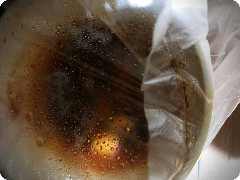 약 2분 경과 후 전자레인지를 열어보니... 기름이 마구 튄 모습입니다. 비닐을 열어봅니다. 많이 우러난 것 같은데.. 살짝 더 끓여보면 좋을 것 같아서 다시 넣습니다. (기름이 뜨거우니 꺼낼 때 조심하세요!)