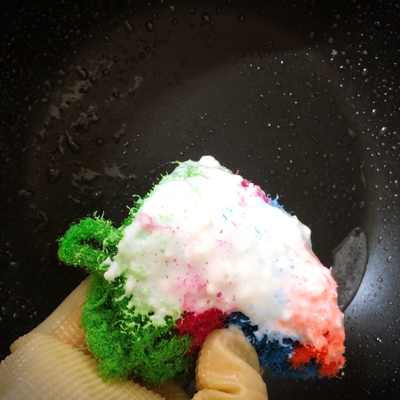 기름기가 있는 프라이팬에 밀가루 세제를 묻히고 닦아주었습니다.