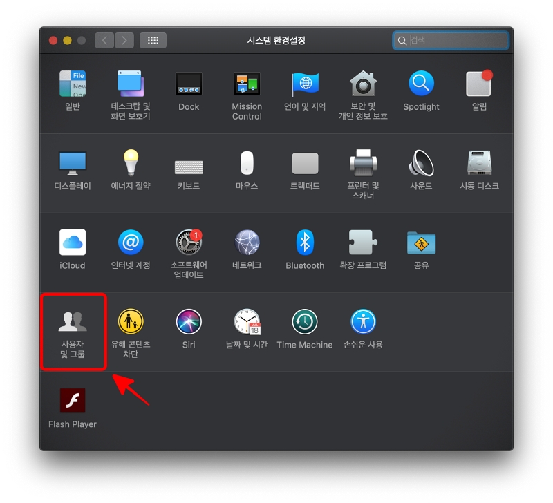 시스템 환경설정에서 - 사용자 및 그룹으로 들어갑니다.