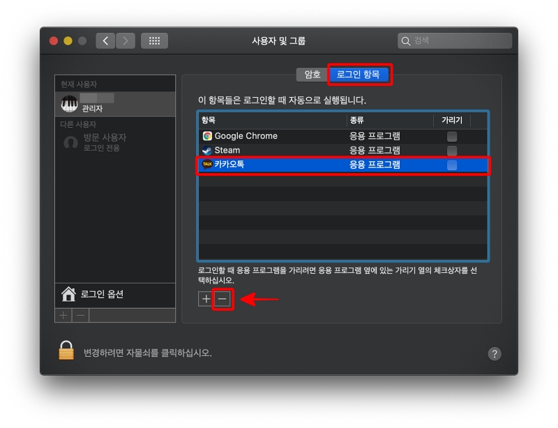 마찬가지로 사과모양 - 시스템환경설정 - 사용자 및 그룹 - 로그인항목 탭으로 들어온 후,