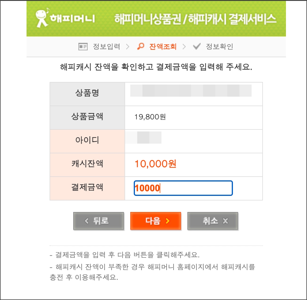 원래 결제 페이지로 돌아옵니다. 그리고 개인정보 제공에 체크해주시면 해피머니 해피캐시 사용이 가능합니다.
