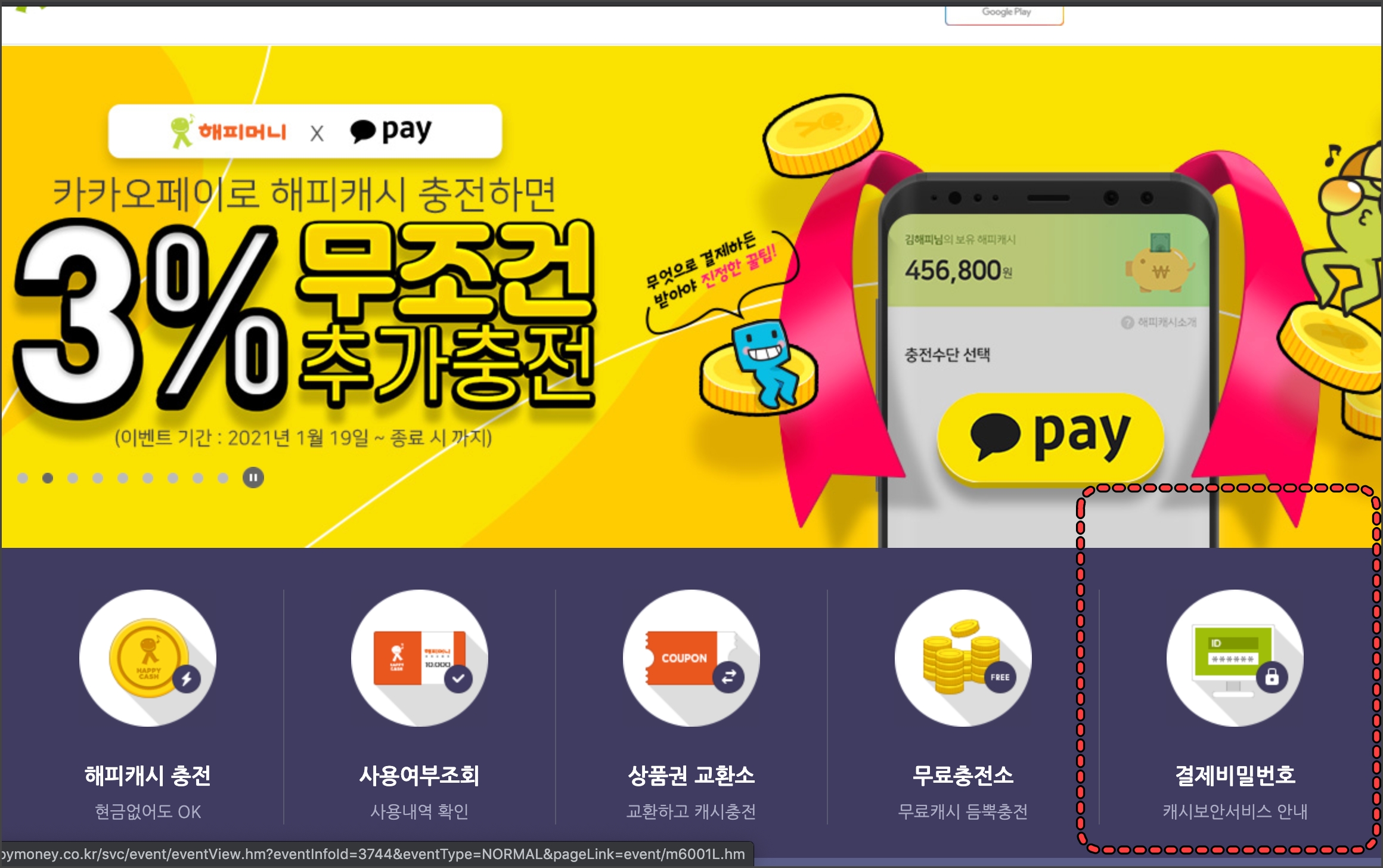해피머니사이트를 열어주세요~ 해피머니 사이트 메인 화면에 결제 비밀번호라고 있습니다.