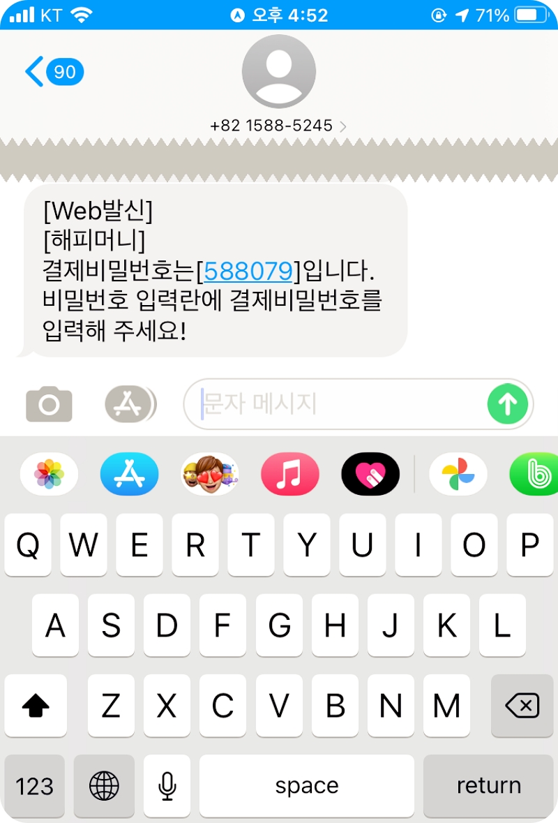 휴대폰으로 결제 비밀번호 숫자 여섯자리가 발송됩니다.