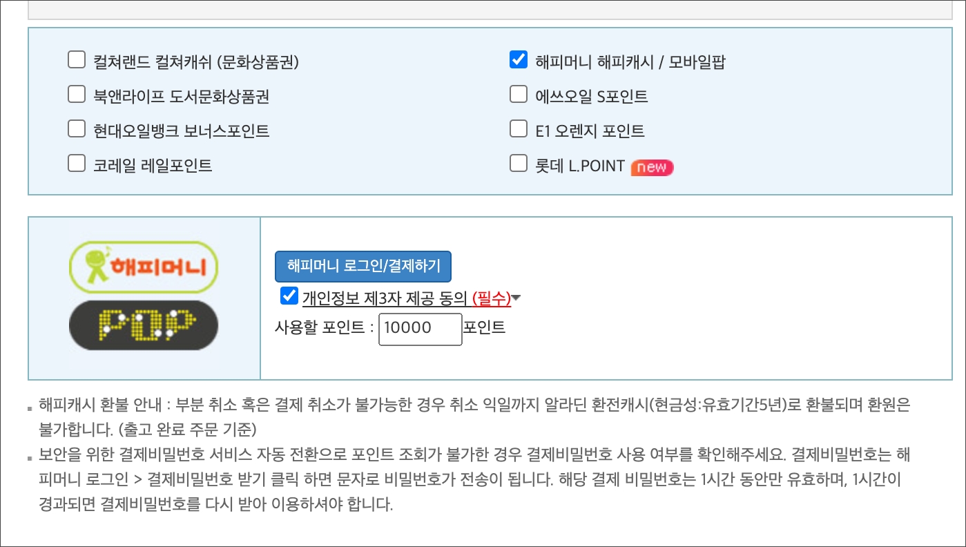 여러 포인트 들 중 해피머니 해피캐시 / 모바일 팝에 체크합니다.