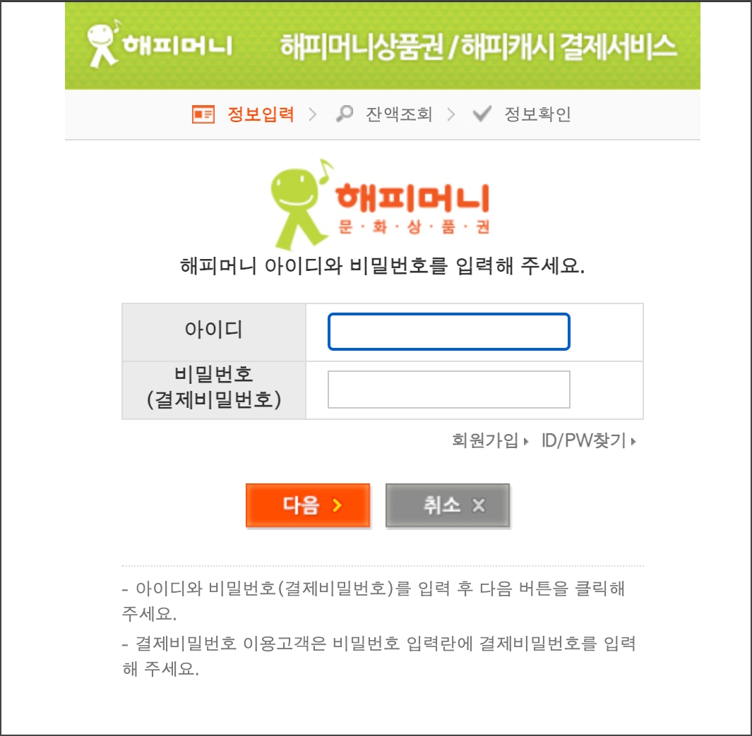 아이디는 해피머니 사이트 가입 시 회원 아이디, 비밀번호는 결제 비밀번호로 사이트에서 부여받는 1회성 비밀번호로...