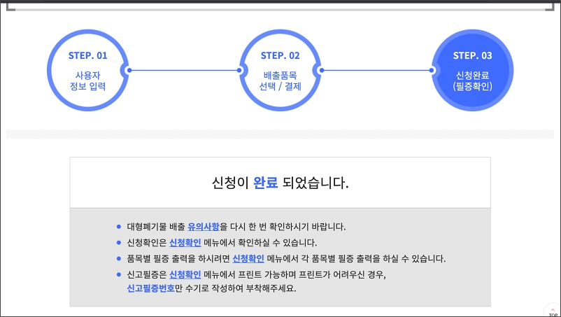 읍면동사무소에 방문하여 신고사항을 작성하고 수수료를 납한 후, 신고필증을 폐기물에 부착하여 배출하면됩니다.