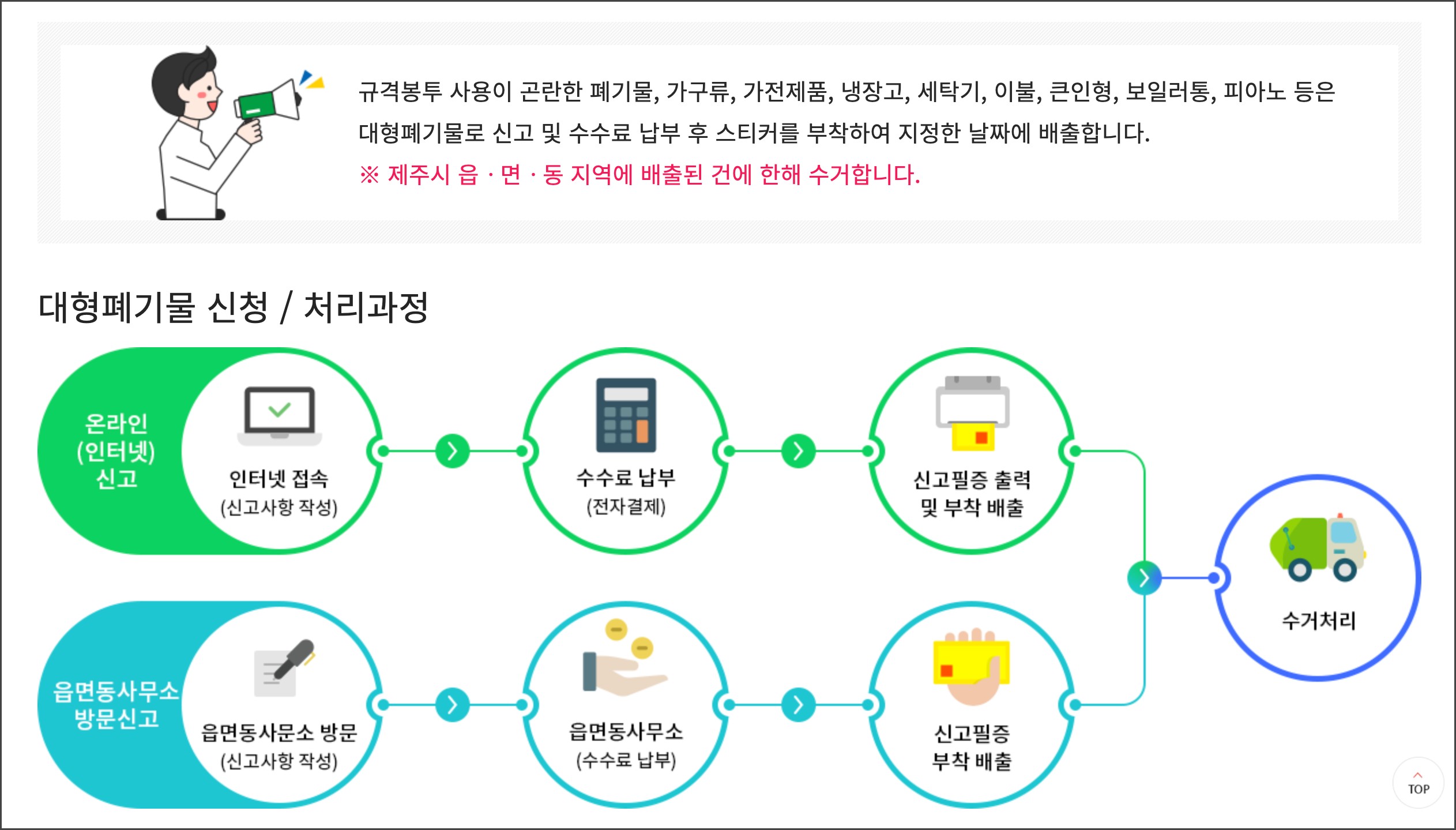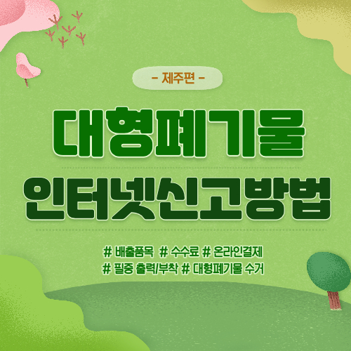 대형폐기물에 대한 안내와 신청까지 보기쉽게 정리가 되어있더군요. 제주도도 쓰레기 문제가 심각하다 보니 많은 노력을 하고 있는 것 같습니다. 물론, 다른 지자체도 비슷하게 운영되고 있을 것 같습니다.