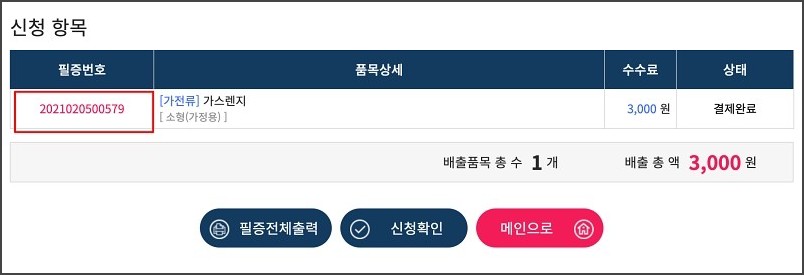 이제 폐기물을 정해진 시간에 배출하면 되고, 하단에 필증전체출력을 선택하여 인쇄한 후 폐기물에 부착하던가,