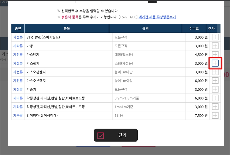 내가 버릴 폐기물의 수수료를 확인하고 선택해줍니다.