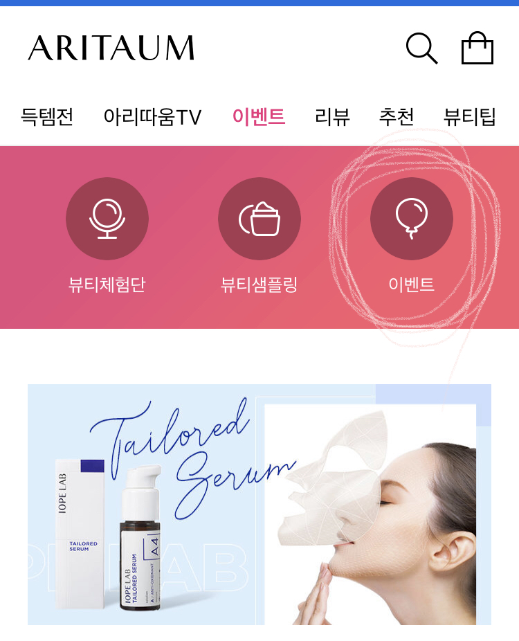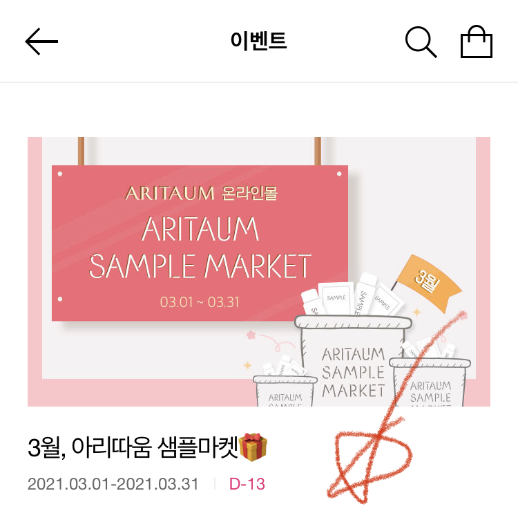 아리따움 앱에 들어가서 쭉 내리다보면 이벤트 부분에 아리따움 샘플마켓 배너가 보이면 클릭하여 들어갑니다.