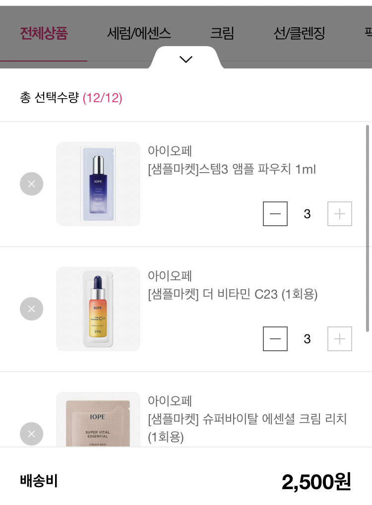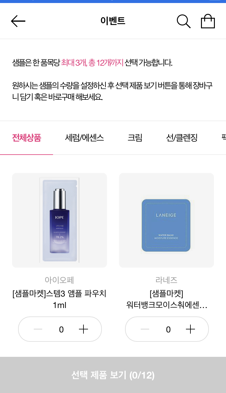 저는 아리따움 앱에서 12개의 샘플을 신청해보았는데요~