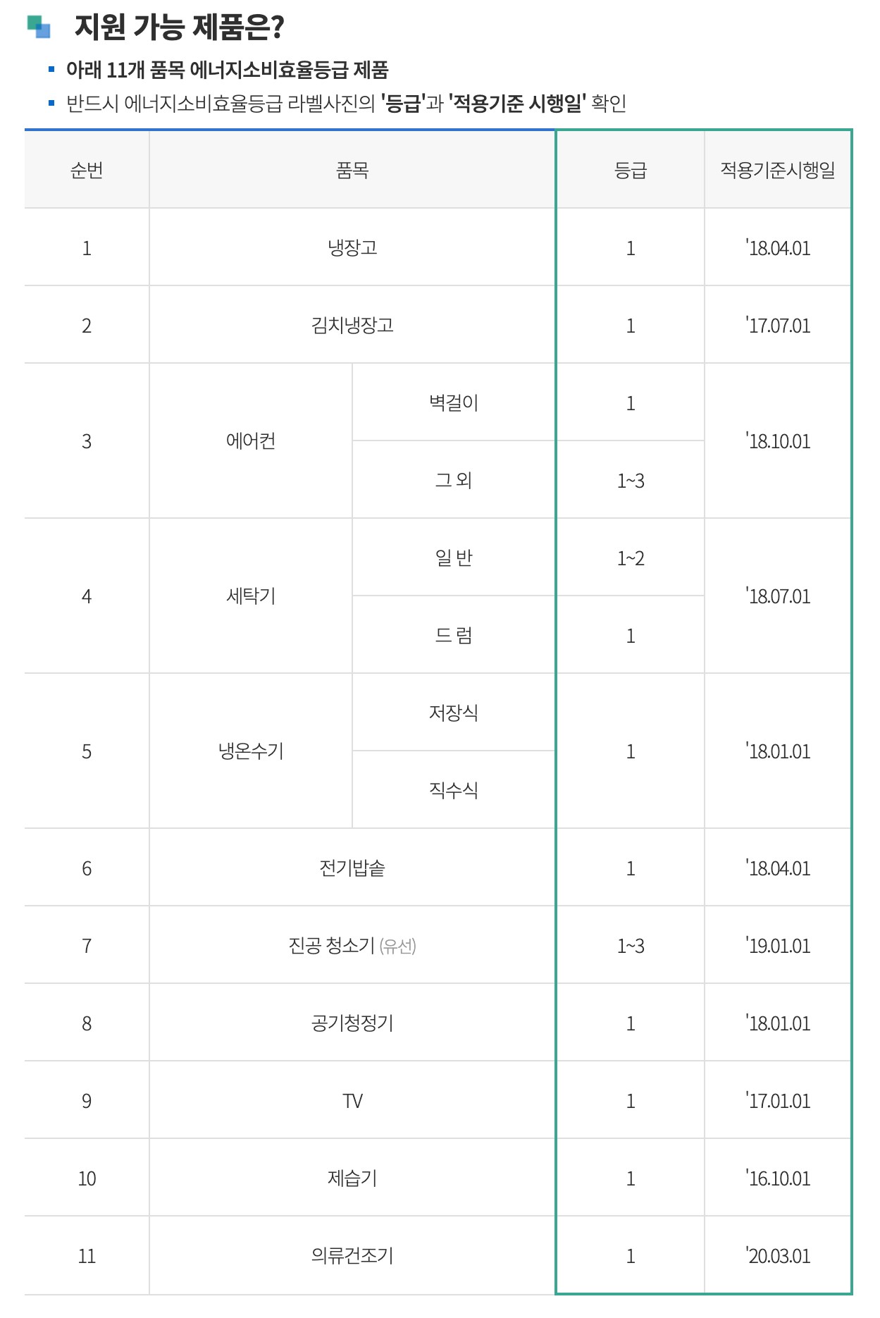 가전제품에 따라 등급과 적용기준시행일이 다릅니다. 아래에서 지원가능품목과 확인 방법을 알아보세요~