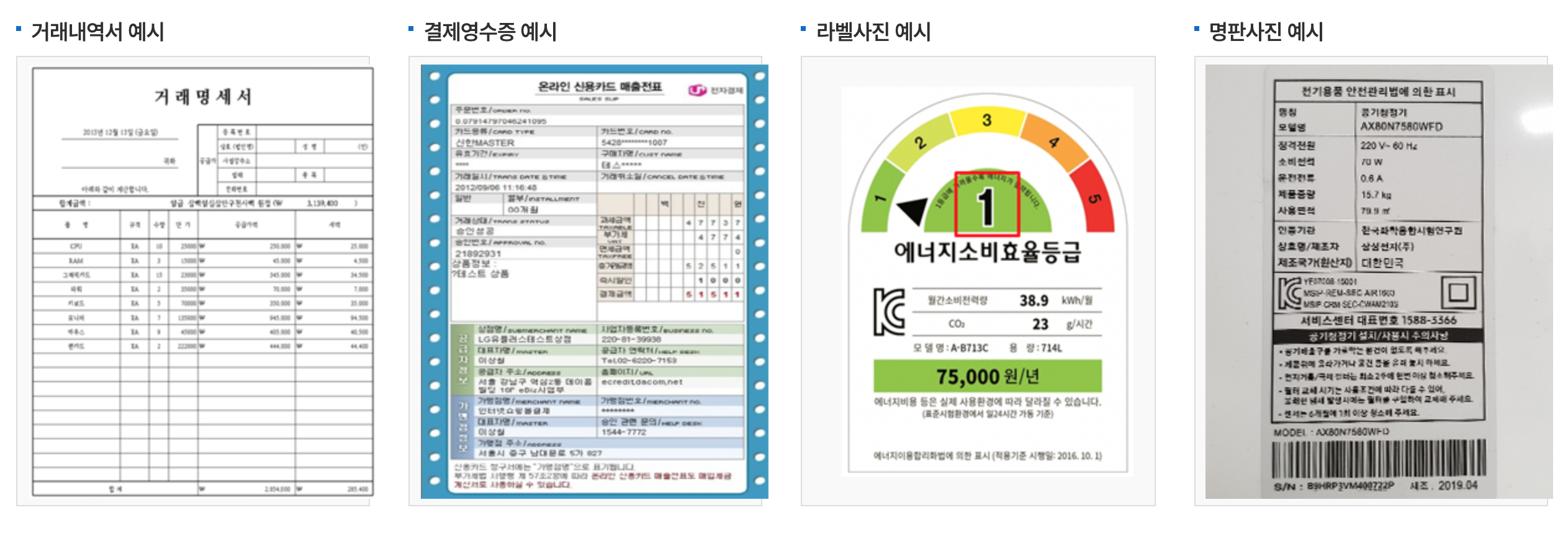 ✔️ 준비서류: 거래내역서, 구매영수증, 에너지소비효율등급 라벨사진, 제조번호 명판사진
