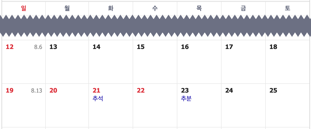 | 9월 | 20, 21, 22일(월 ~ 수) | 추석(9월 21일) |