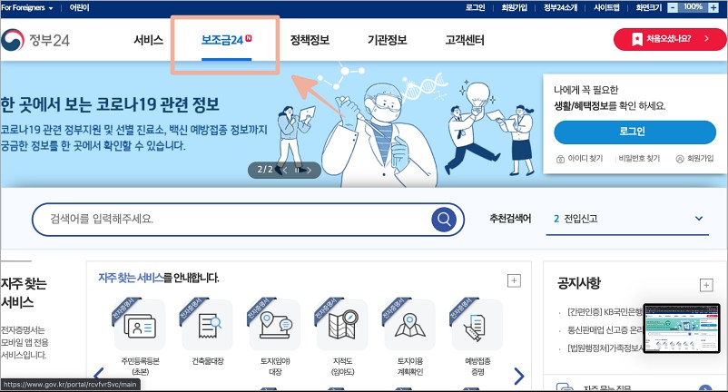저도 몰라서 못 받는 게 있는지 확인해보고 싶어서 정부 24 웹사이트로 들어가서 확인해보았습니다.