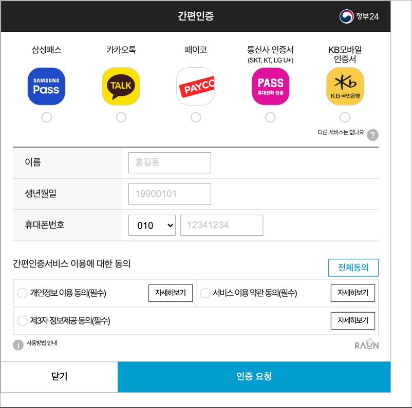 일일이 찾아다닐 필요없이, 정부 24에서 개인정보 입력 없이, 이용 동의 한 번으로 누구나 쉽게 이용할 수 있습니다.