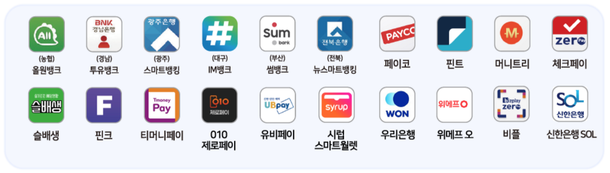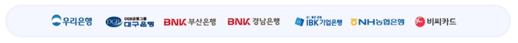 신한은행, 우리은행 KB국민은행, 대구은행, BNK부산은행, 광주은행, 전북은행, BNK경남은행, 수협, 신협, NH농협은행, 우체국, MG새마을금고, IBK기업은행, SH수협은행, 하나은행