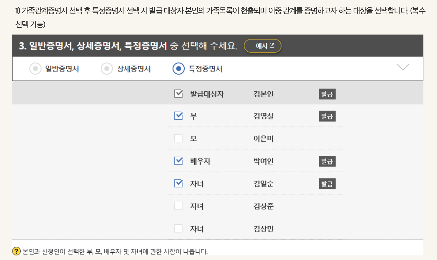 가족관계증명서를 발급받을 때, 특정증명서를 선택하면 위와 같이 발급대상자를 선택하여 발급받을 수 있습니다.