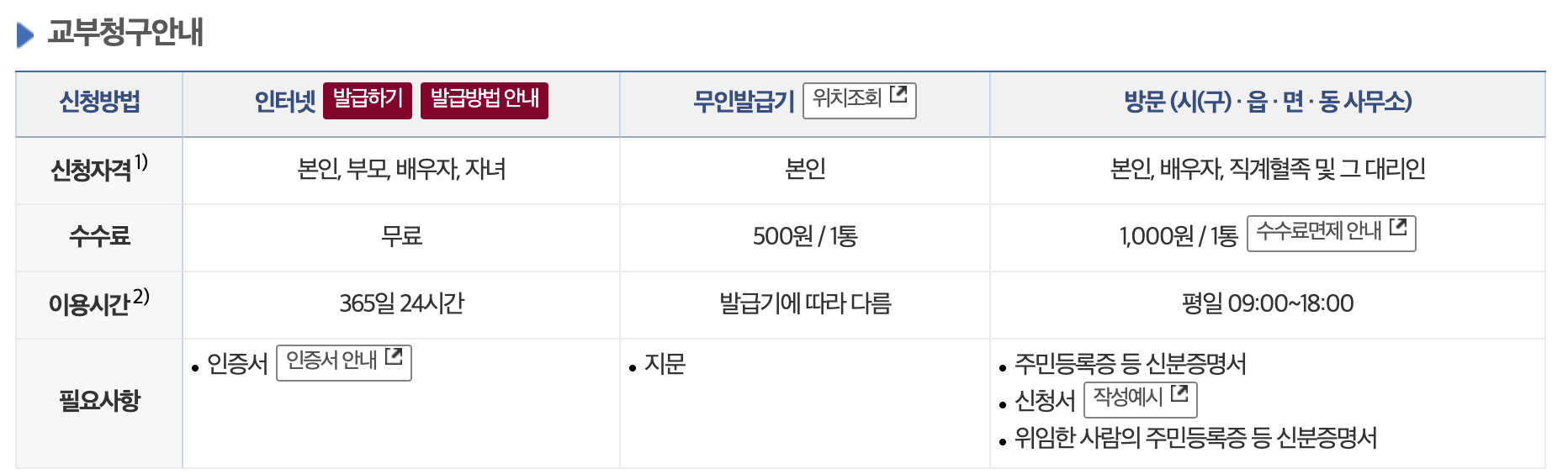 - 무인발급기는 500원의 수수료가 부과되고 본인이 지문으로 발급이 가능합니다.
