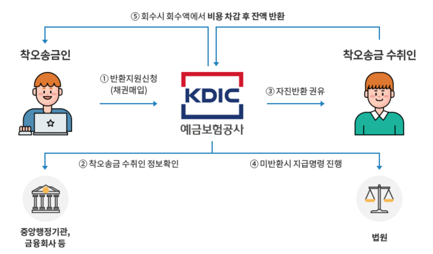 - 예금보험공사는 행정안전부, 금융회사, 통신사를 통해 착오송금 수취인의 정보를 확인합니다.