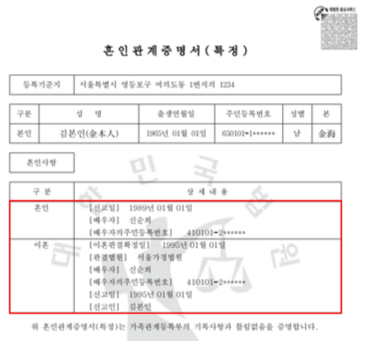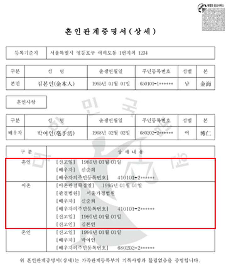 다만, 혼인관계증명서(상세)에는 현재 뿐만 아니라 과거의 혼인 및 이혼에 관한 모든 사항이 나옵니다.