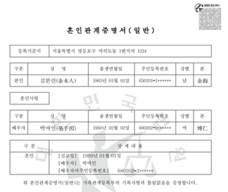 혼인관계증명서란 본인 및 배우자에 관한 사항과 혼인에 관한 사항이 기재되는 증명서로 일반, 상세, 특정의 세가지로 발급이 가능합니다.